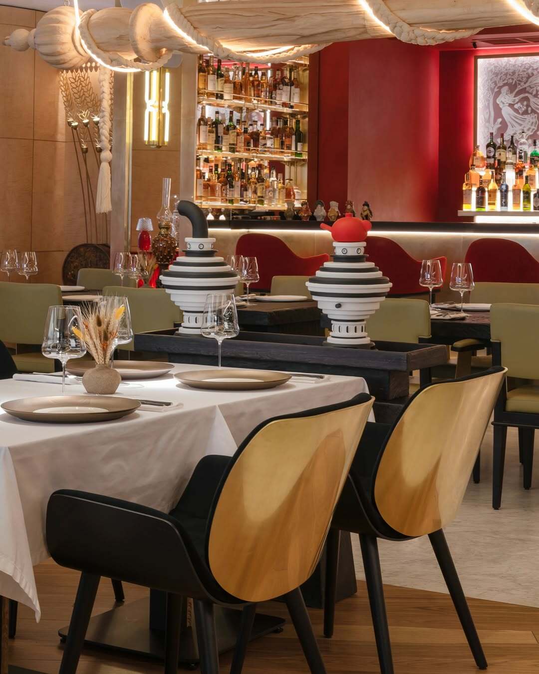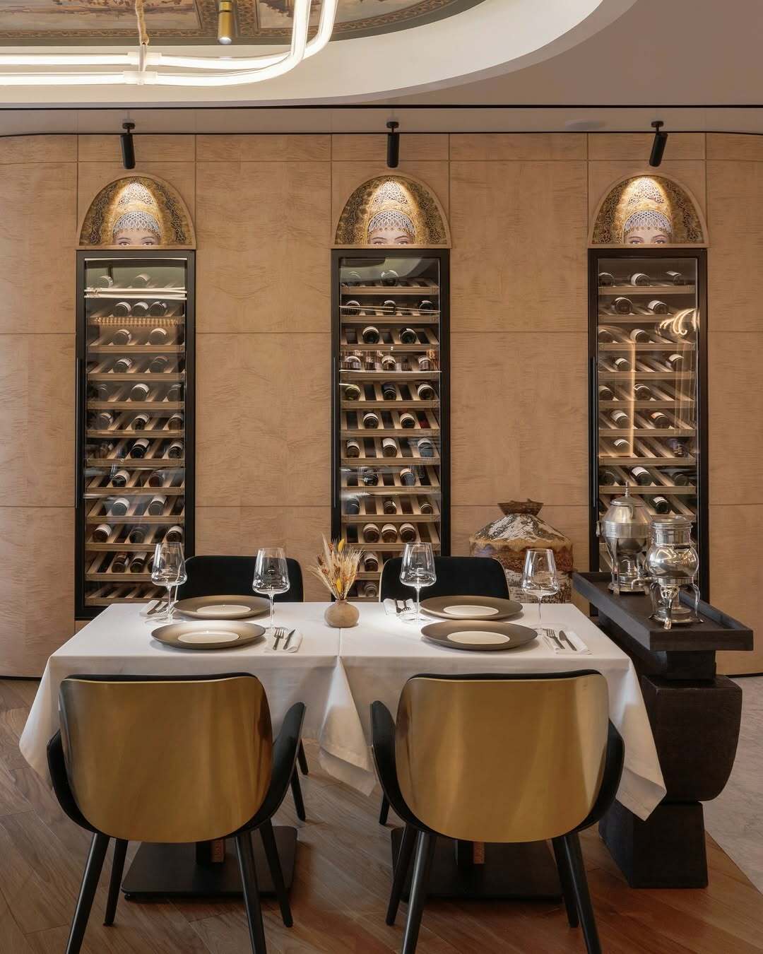 Пространство ресторана, разработанное бюро ARCHPOINT, – это материализованная концепция. Дизайнеры переосмыслили мотивы русских народных промыслов, парадной архитектуры XIX века и добавили литературные аллюзии. Сердцем интерьера стала стена с портретами «Машенек» – собирательных образов реальных женщин по имени Мария из разных исторических эпох, объединённых силой и изяществом. Этот арт-объект превращает посещение ресторана в диалог со временем.