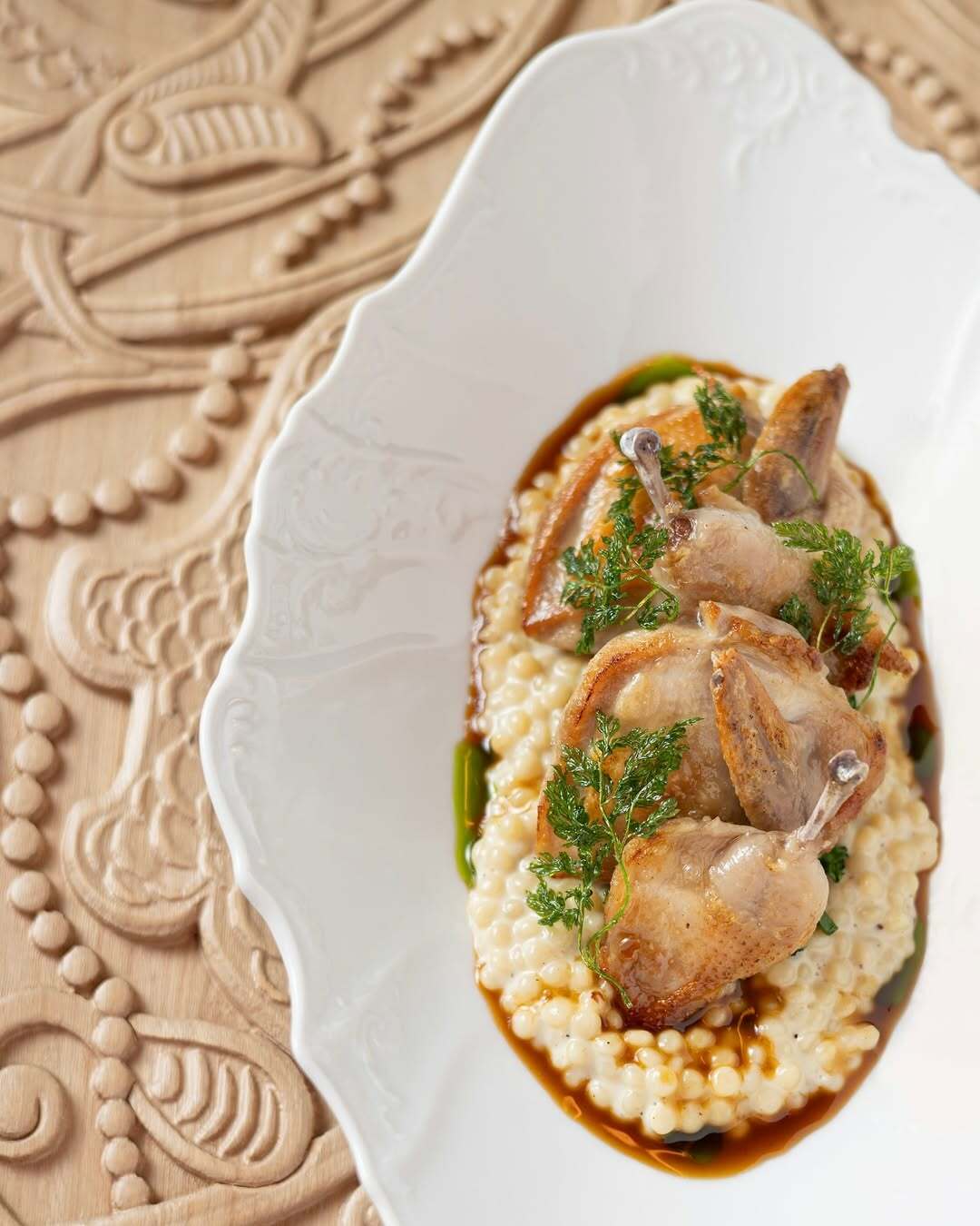 Во главе кухни «Машеньки» стоит шеф-повар Игорь Гришечкин, известный своим умением работать с локальными продуктами. Его задача – представить русскую гастрономию как живую и актуальную, избегая стереотипов. В меню классические ингредиенты получают новое звучание: ладожский судак подается с тушёным луком-пореем и соусом беарнез, а из раков готовят «настоящие» сосиски, которые сервируют с соусом биск и воздушным картофельным пюре. Даже десерты удивляют: в тирамису добавляют кориандр, создавая тонкую аллюзию на аромат бородинского хлеба.