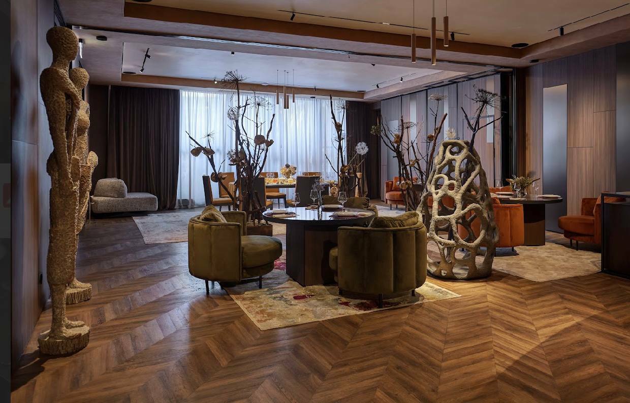 - Первый уровень и лаунж встречают гостей эклектичным интерьером, где колонны, скульптуры и камин создают ощущение приватного клуба.