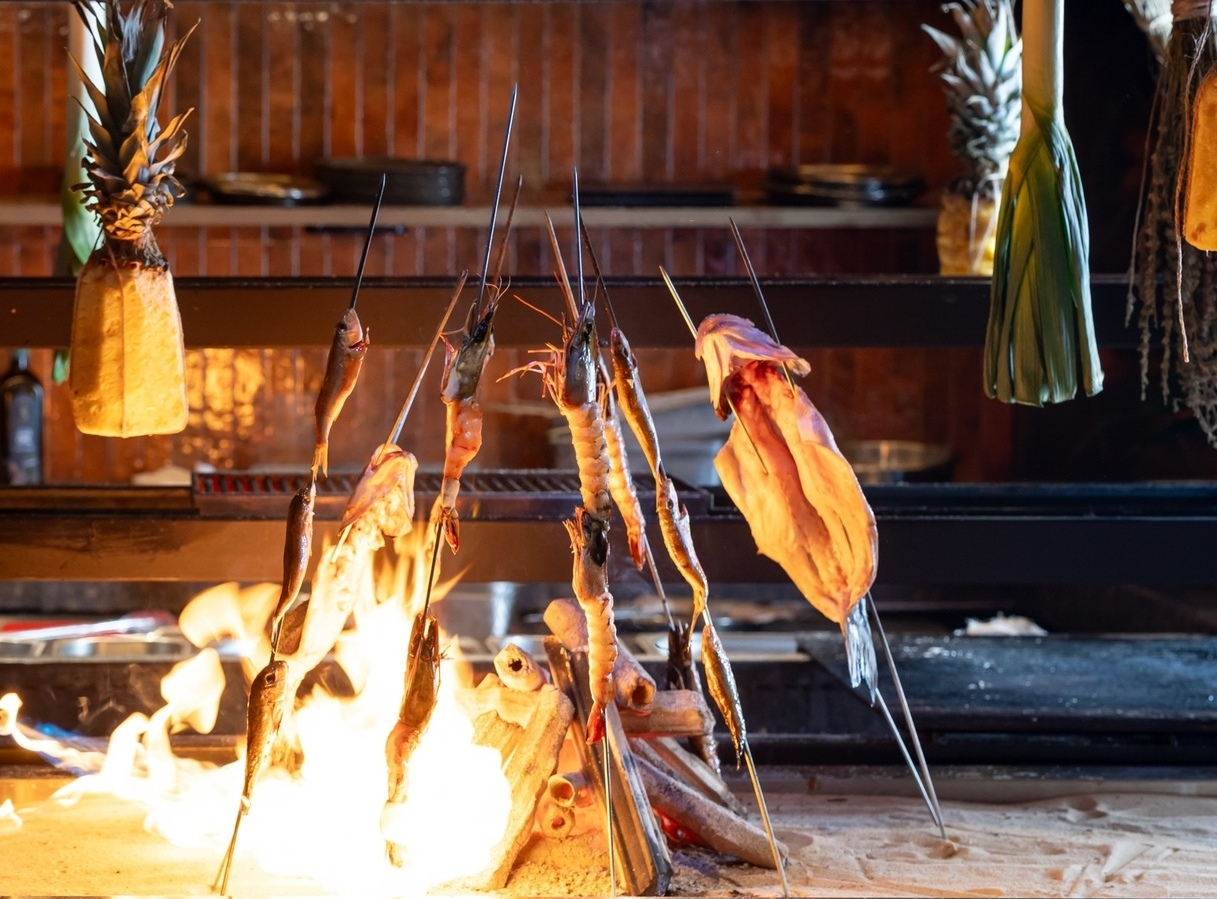 Главное гастрономическое открытие Yuma — песчаный гриль, единственный не только в Москве, но и в России. Это эффектное шоу, разворачивающееся на глазах гостей: рыба и морепродукты готовятся в раскаленном песке. Благодаря этой технологии продукты пропитываются легким дымом, остаются невероятно сочными и мягкими внутри, но приобретают аппетитную карамельную корочку снаружи. В Yuma на песчаном гриле готовят дикого сибаса, королевские креветки и другие деликатесы.