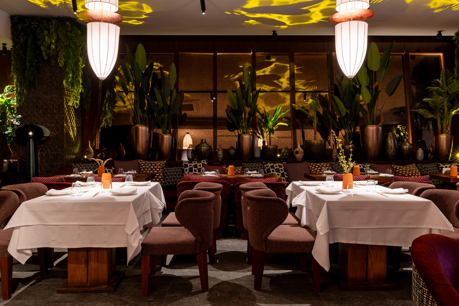 Ресторан Yuma встречает гостей сложной архитектурой зала, который разделен на уютные сценарии, не теряя при этом монументальности. Пространство утопает в буйной зелени, где каждый уголок дышит уединением: эклектичная мебель и продуманная рассадка превращают каждый стол в отдельную вселенную со своим настроением и историей. Над головой парят люстры-купола, а для приватности предусмотрены отдельные кабинеты, выдержанные в строгой эстетике лаковых японских шкатулок.