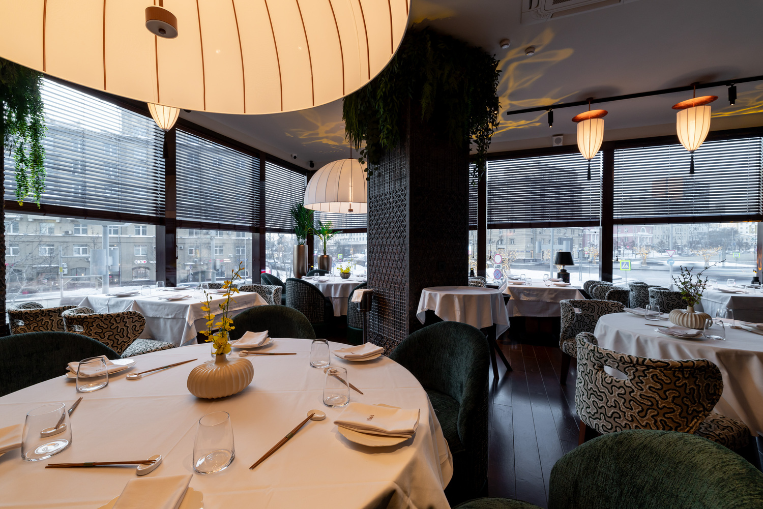 Безусловная доминанта интерьера — широкоформатные окна, с высоты открывающие вид на вечно движущееся Садовое Кольцо, которое органично вписано в ясные архитектурные формы классического ресторана.