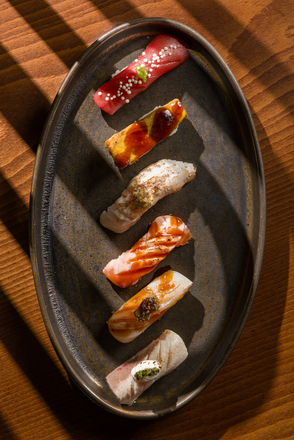 - Суши и сашими: В основе — редкие cuts рыбы. Шеф предлагает суши с торо (самая жирная часть тунца блюфин, 1450 руб.), аками (мышечная часть с насыщенным вкусом, 1100 руб.), маслянистую хамачи (желтохвост, 700 руб.) и сладкую креветку батан эби (550 руб.).