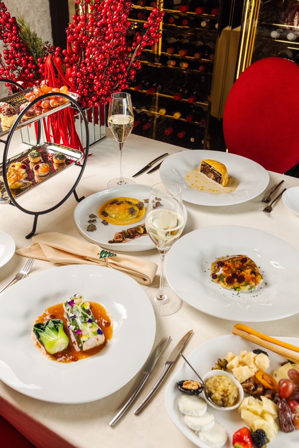 Со зрелищным шоу вполне может посоперничать гастрономическая часть праздника — в подаваемых блюдах переплетаются национальные традиции и европейская элегантность. Новогодний стол побалует многочисленными ассорти бриошей (например, со страчателлой и боттаргой из морских ежей среди прочих), русских пирожков и рыбы, красной икрой с блинами и фруктами. Порционно предусмотрены салат «Холодец» с говяжьим языком и копченым виноградом и жюльен из белых грибов с черным трюфелем в качестве закусок. Как основное блюдо можно заказать черную треску под сливочно-икорным соусом или щечки теленка с жареной полентой.
