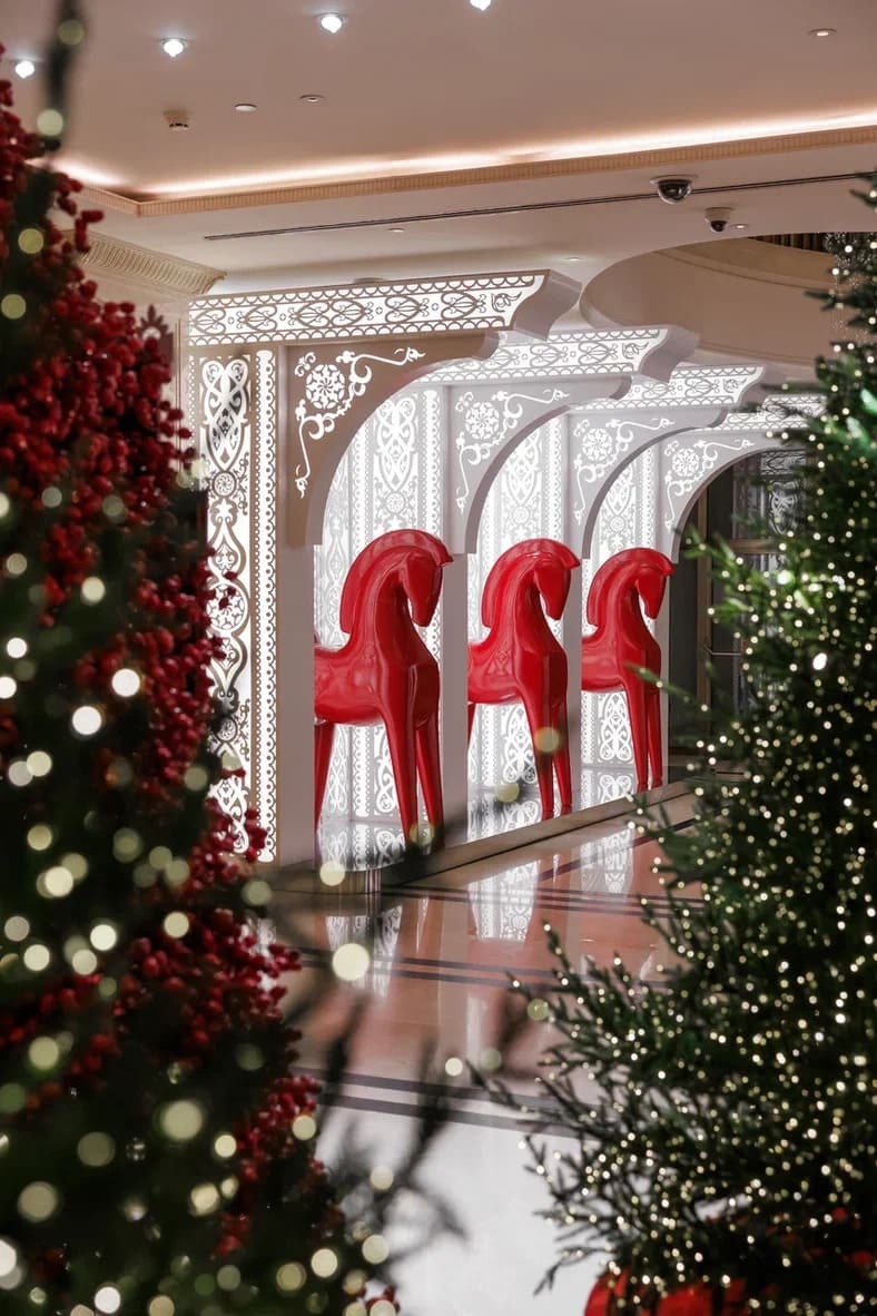 С конца ноября Four Seasons Hotel Moscow в самом сердце столицы превращается в живую сказку. Аркада сверкающих порталов с огненными лошадьми встречает гостей в лобби и проводит их к центральной инсталляции. Фантастический красный цвет, символизирующий удачу в наступающем году, словно обнимает теплом после морозного воздуха. В резных фигурах и многогранных фрезеровках открываются яркие мотивы русских народных промыслов.