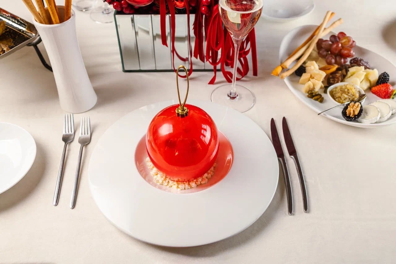Цветом праздника станет десерт — красный шар на основе клубничного мусса с ликером «Малибу» и карамельного бисквита. Параллельно рекой польется изысканное Lanson Le Black Creation Brut. Можно запросить вегетарианскую или детскую версию стола.