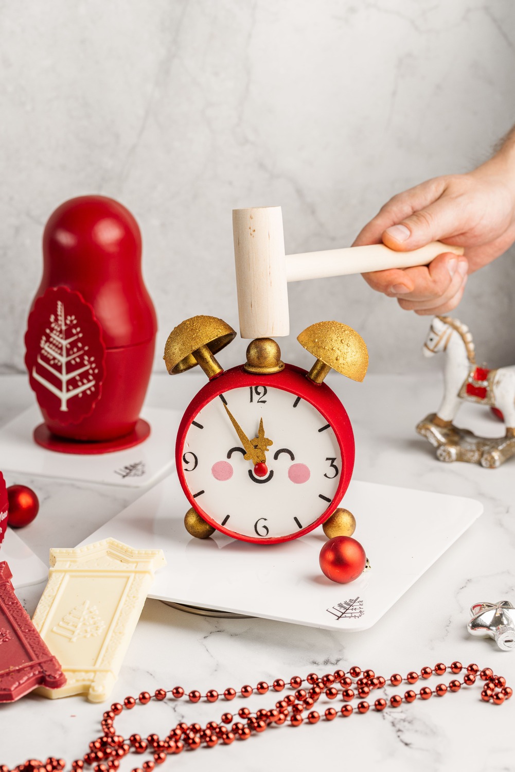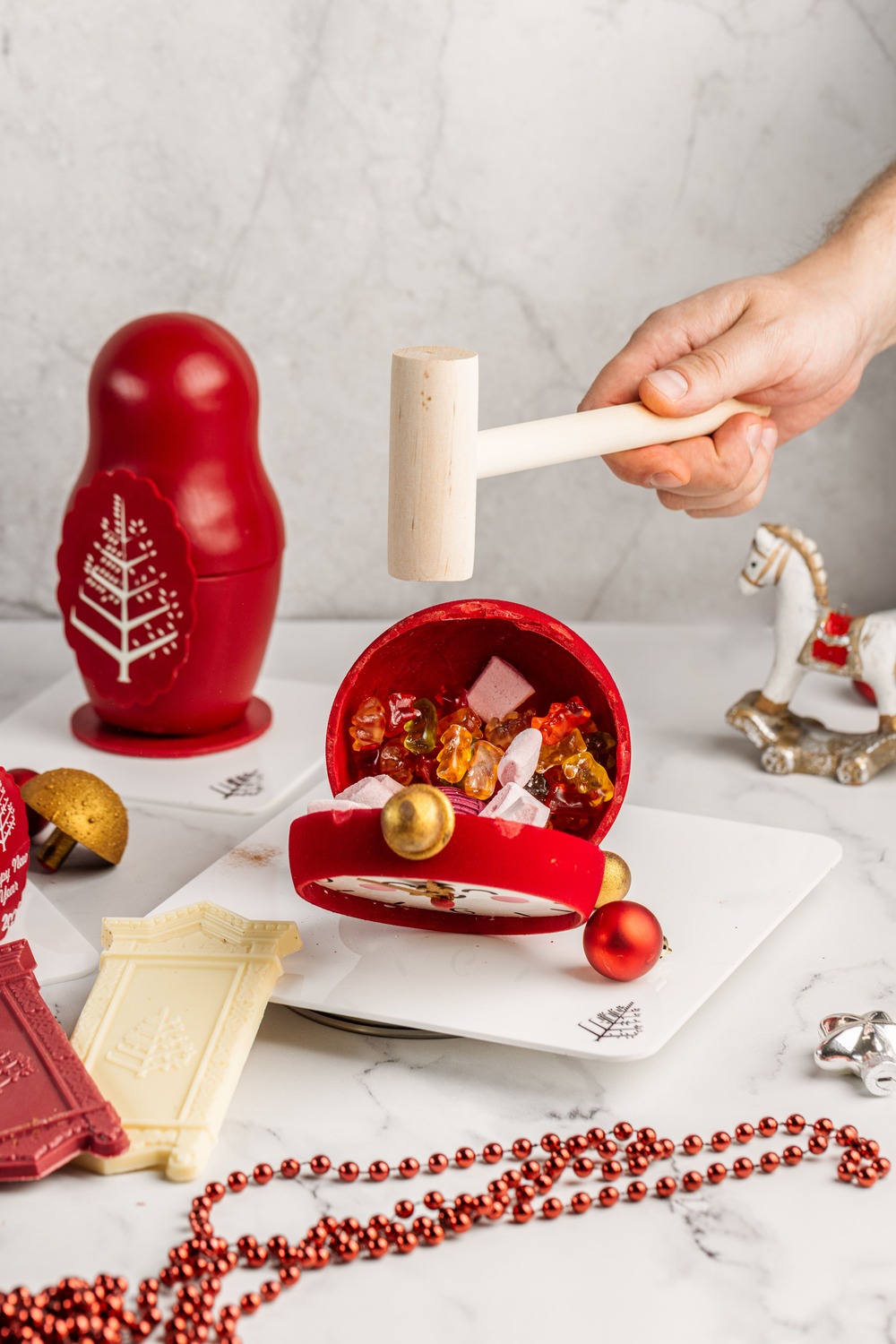 Каждое лакомство — это не только вкусное угощение, но и частичка душевного тепла. Авторские работы пропитаны ароматом праздника и присыпаны верой в чудеса. Шоколадные конфеты, карамельные леденцы-петушки и плитки в виде резных ставней — все это хочется рассматривать без остановки. На игрушки похожи красная лошадка из шоколада, сладость в виде елочного украшения и большая матрешка. Десерт в виде будильника подается с небольшим молоточком, чтобы разбить его, словно пиньяту, и получить больше сюрпризов.