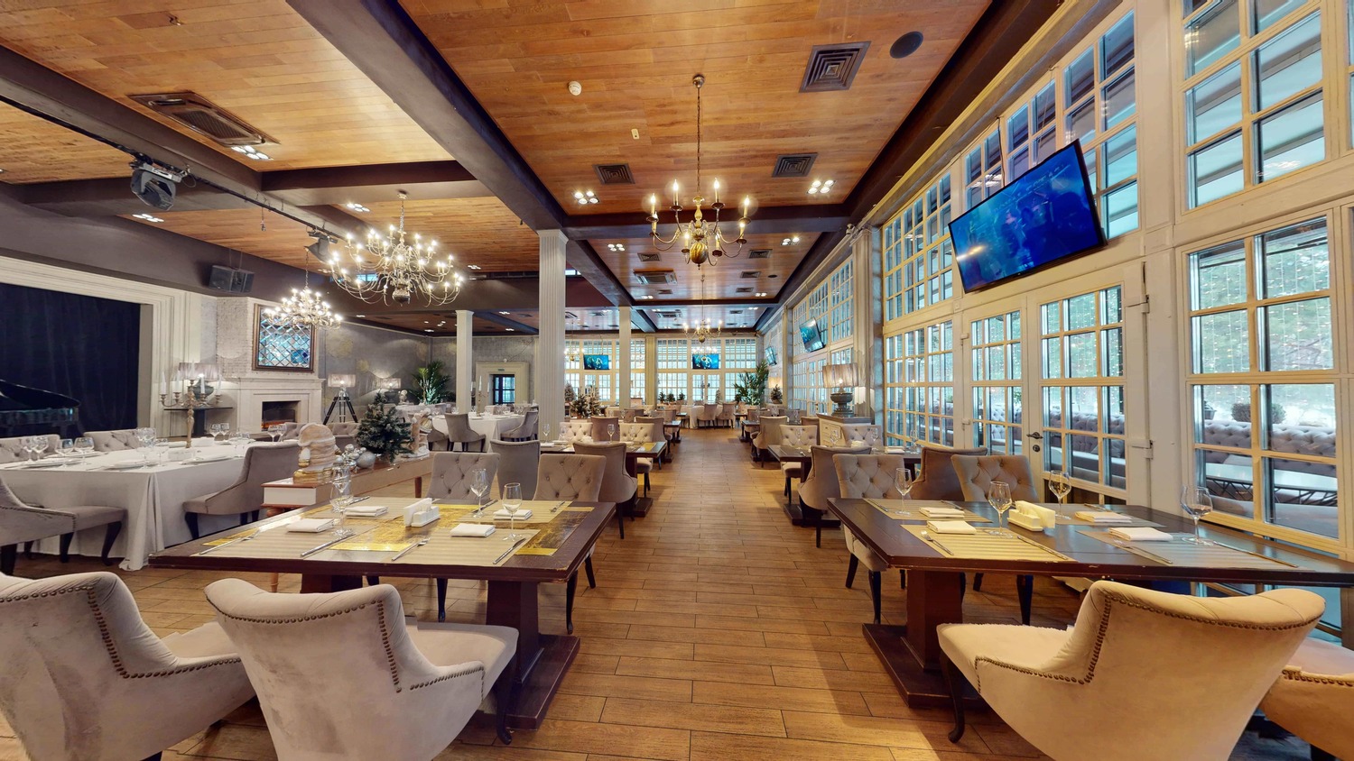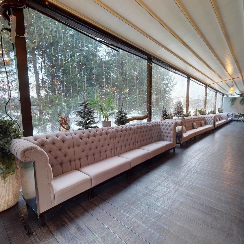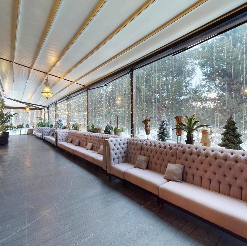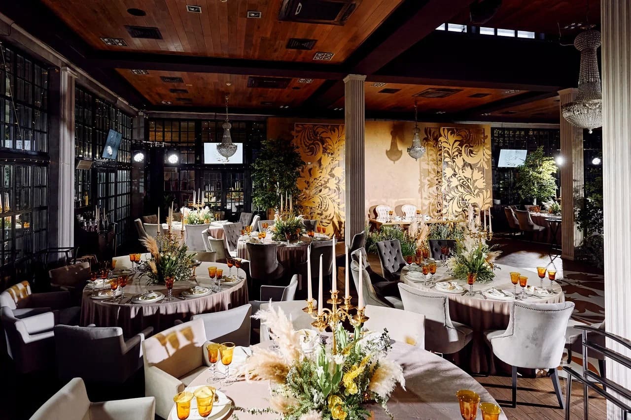 Пространство ресторана претерпело значительные архитектурные изменения, еще больше расширив возможности для проведения грандиозных событий. Шесть метров высоты, панорамные окна, наполняющие залы естественным светом, и продуманная трансформация пространства работают на впечатление. Это идеальная загородная площадка для свадьбы или корпоратива, способная воплотить самые смелые декораторские замыслы: от таинственного сада до торжественного королевского банкета.