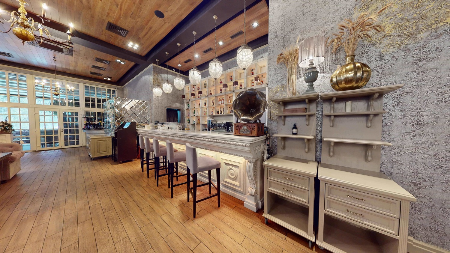 Сердце ресторана — просторный главный зал с элегантной верандой, воплощающий идею роскошного банкетного зала в Подмосковье. После реконструкции он готов принимать до 200 гостей. Высокие потолки, панорамное остекление и собственная терраса с витражами создают воздушную, светскую атмосферу. Это выбор для тех, кто ценит размах и безупречный стиль.