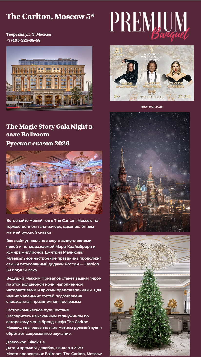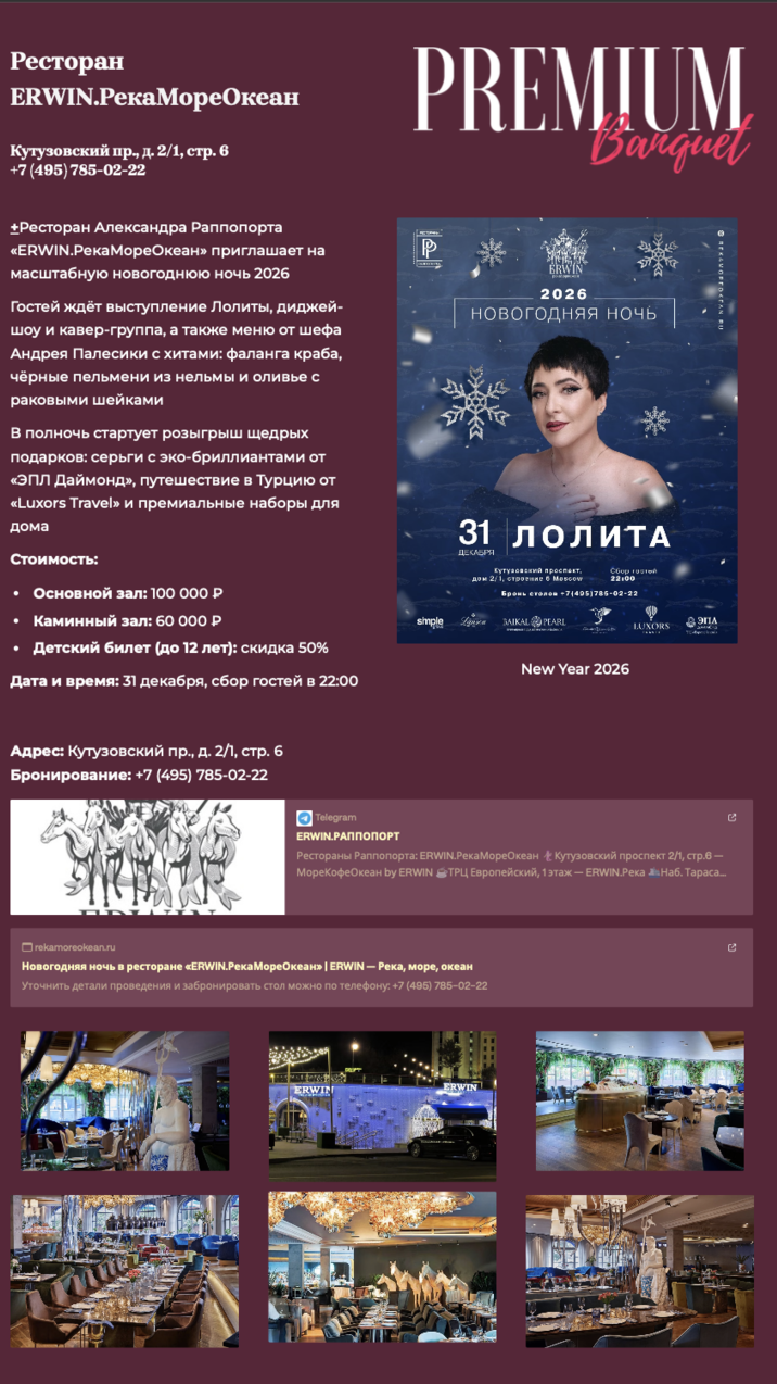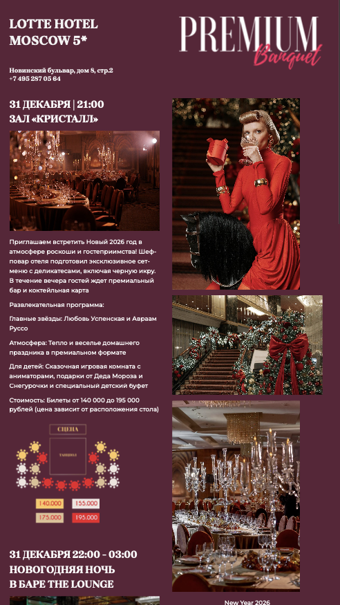 Скачивайте эксклюзивный Новогодний гайд от Премиум Банкет. 30 изысканных ресторанов для празднования новогодней ночи 2026. Детальное описание программ и концепций. Актуальные цены и условия бронирования. Адреса, телефоны, ссылки на сайты и социальные сети ресторанов. Гайд сэкономит время гостей на поиск и поможет выбрать идеальное место для встречи Нового 2026 года