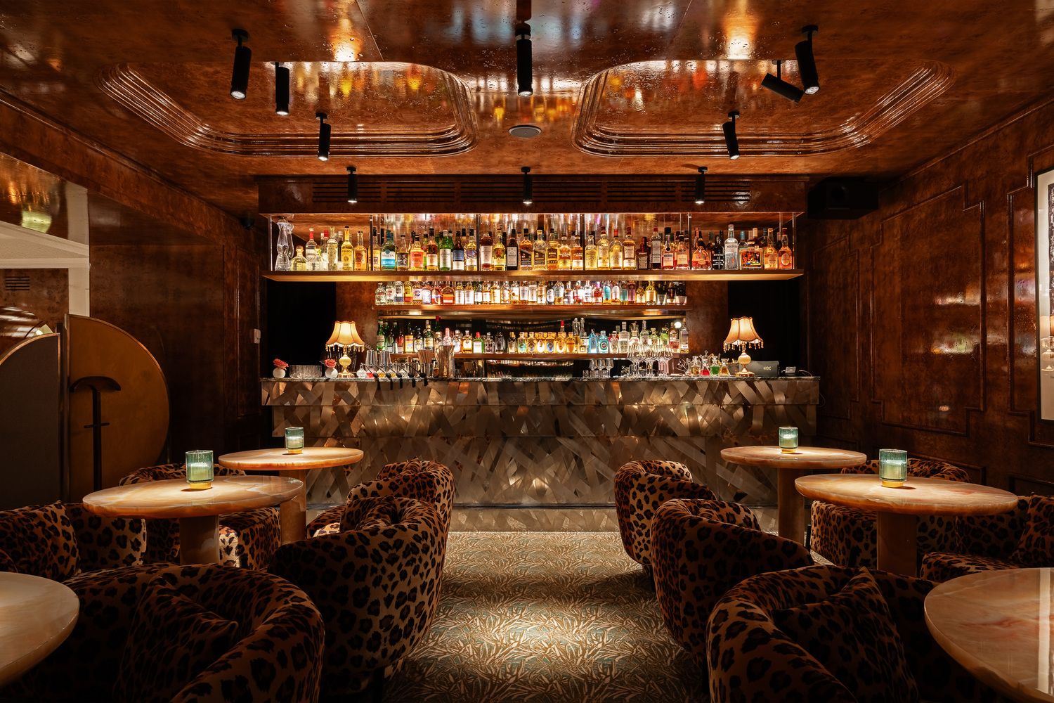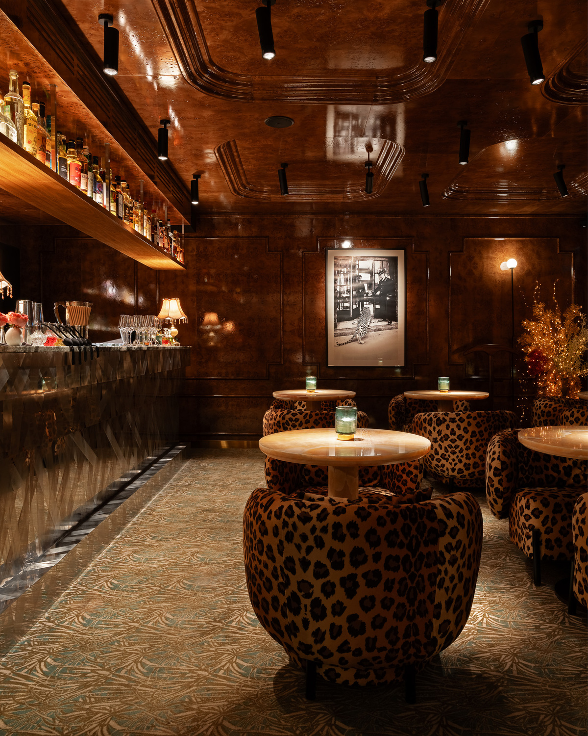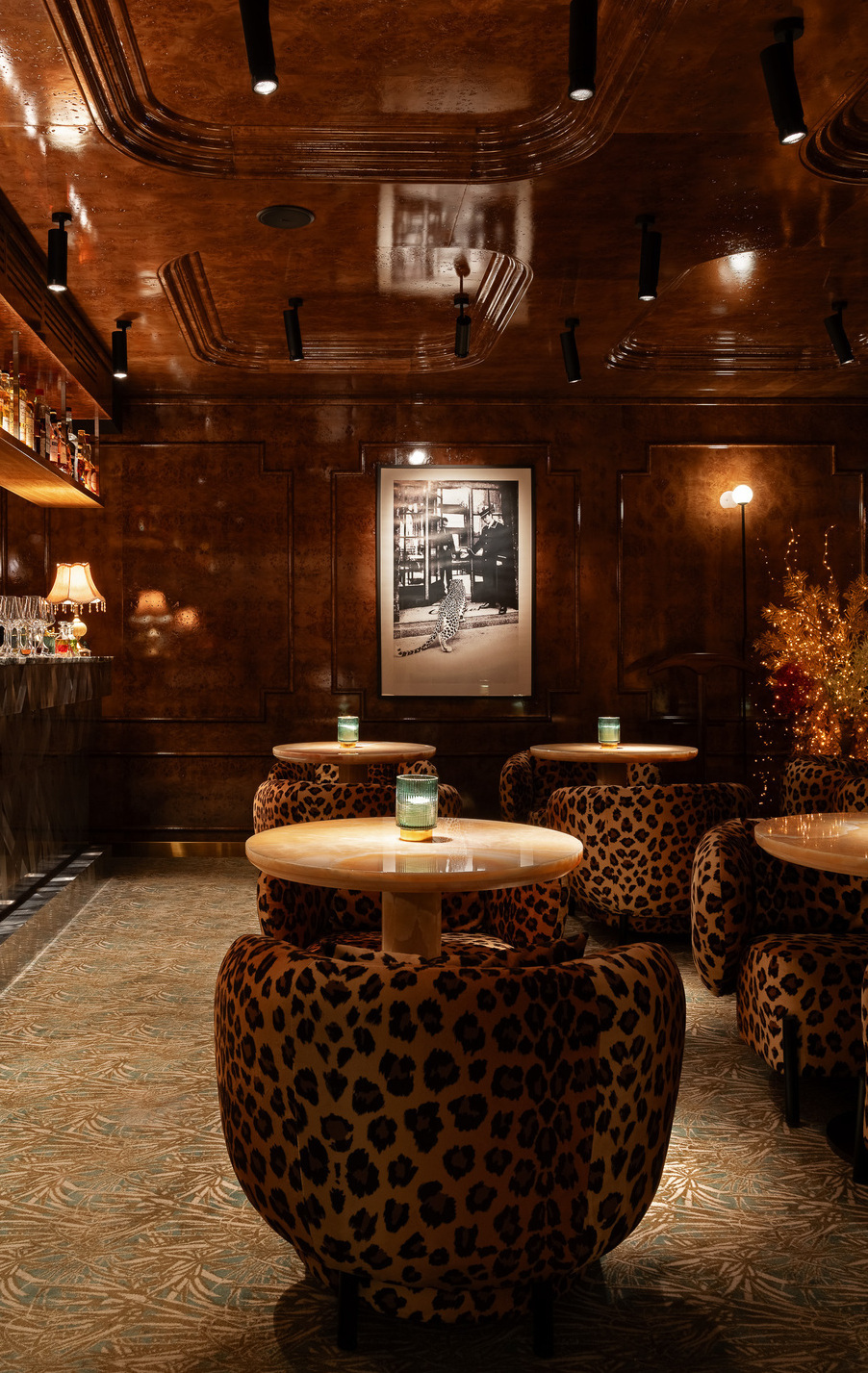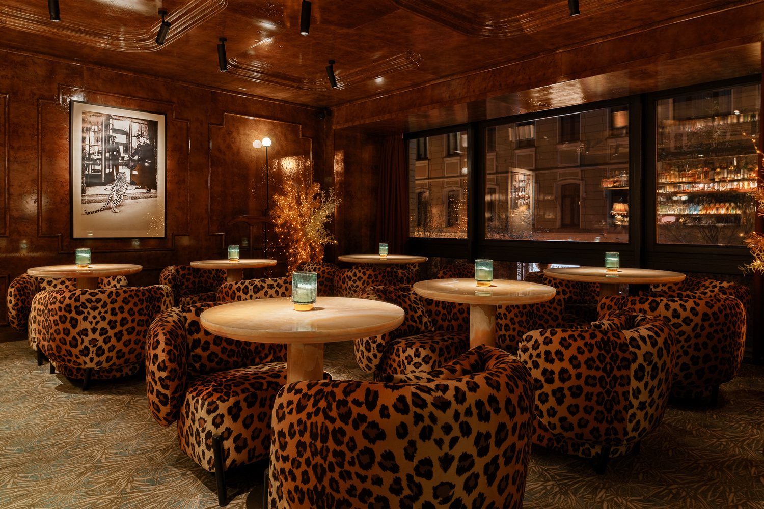 Лаундж-зал «Леопард» (банкеты до 16 гостей): Камерная роскошь для избранных. Интерьер в стиле Старого Света с мотивами непокоренной природы повышает градус страсти до предела. Идеальное решение для элитного дня рождения или девичника в стиле Dolce & Gabbana.