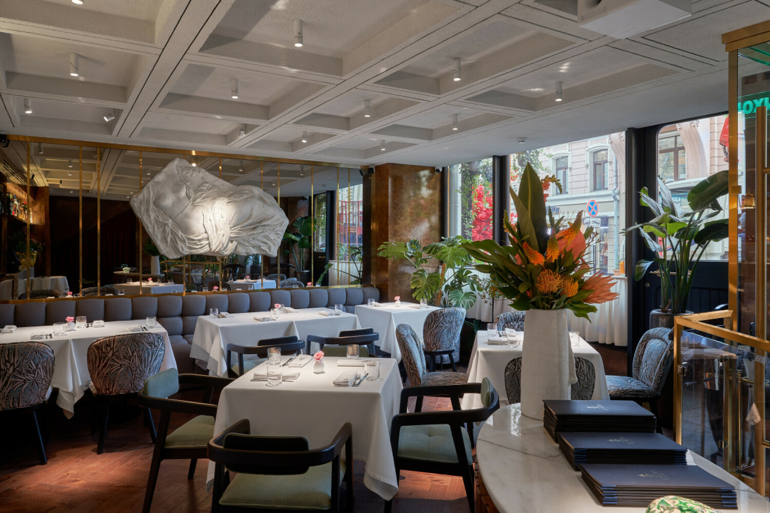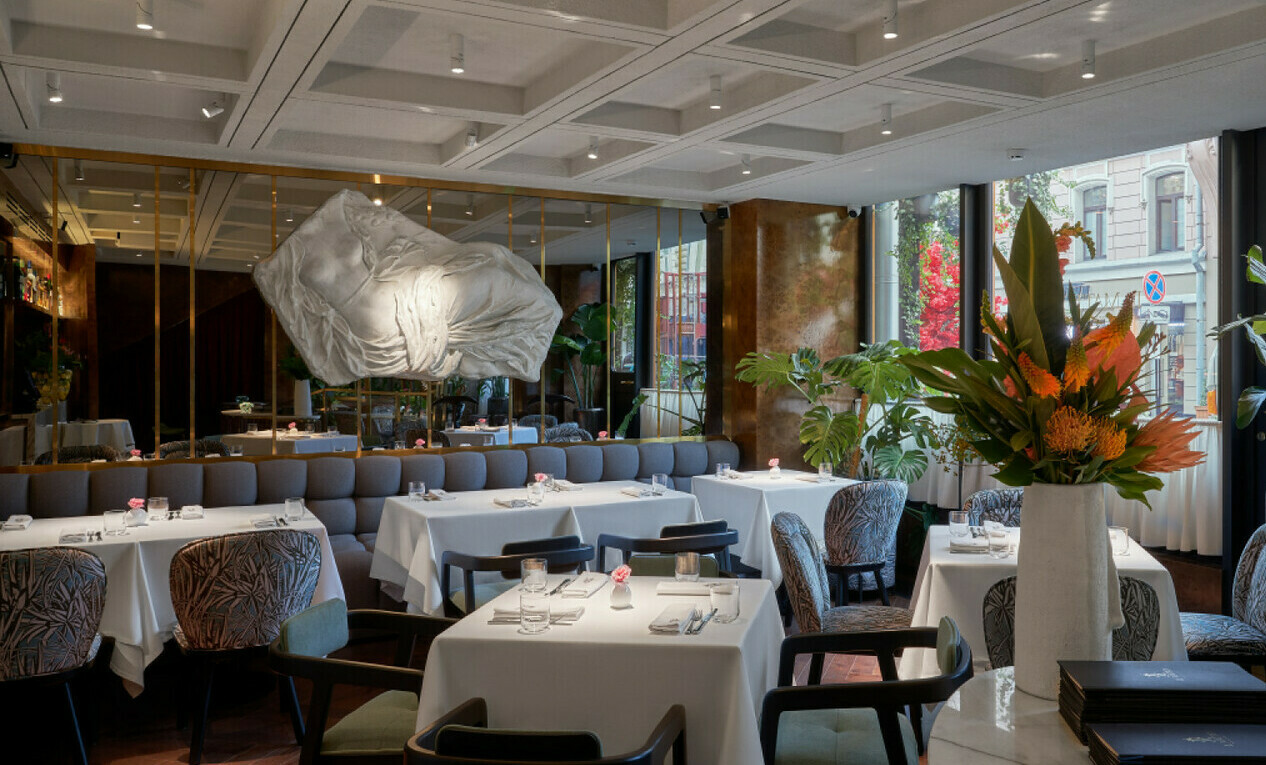 Основной зал (банкеты до 50 гостей) : Светлые тона, панорамные окна с видом на сквер Майи Плисецкой. Арендуя ресторан целиком, вы получаете безраздельную власть над пространством, где ни одна деталь не ускользнет от внимания гостей.
