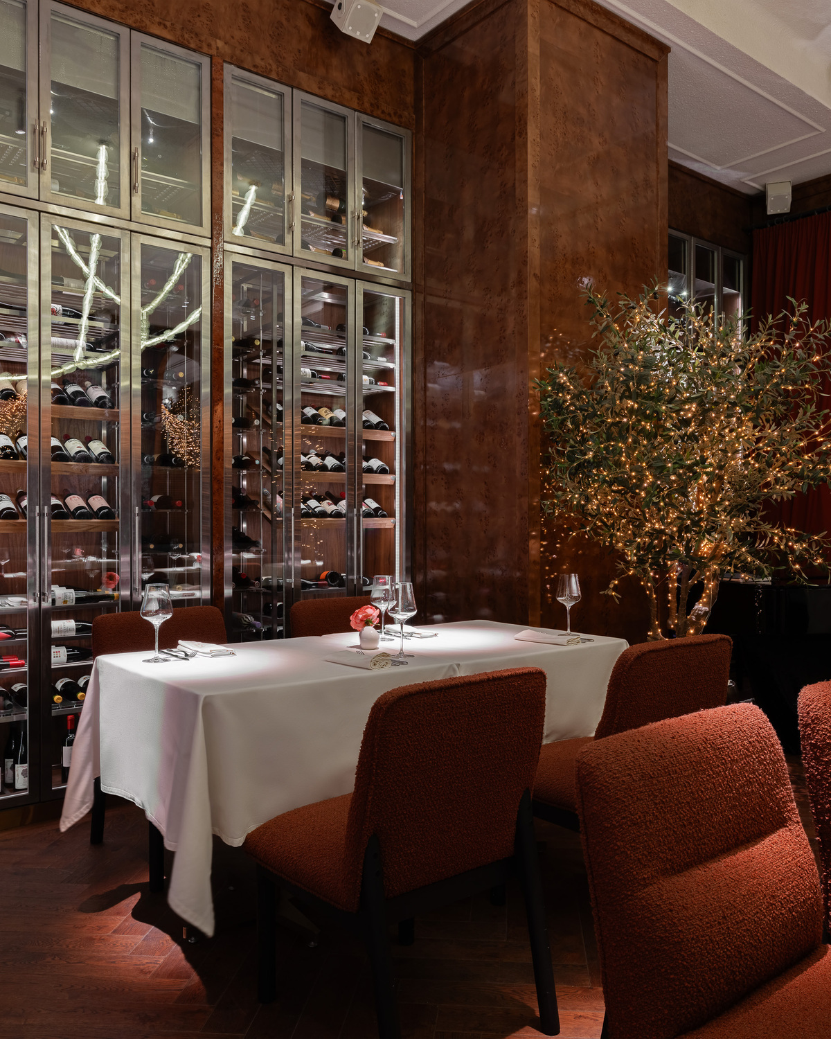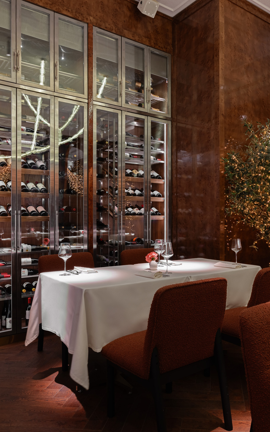 Винный зал (банкеты до 45 гостей): Античные образы, мягкий свет, напоминающий вечера на тосканских виноградниках, и богатство винных полок. Пространство для изысканных бесед и свадебного ужина в кругу самых близких.