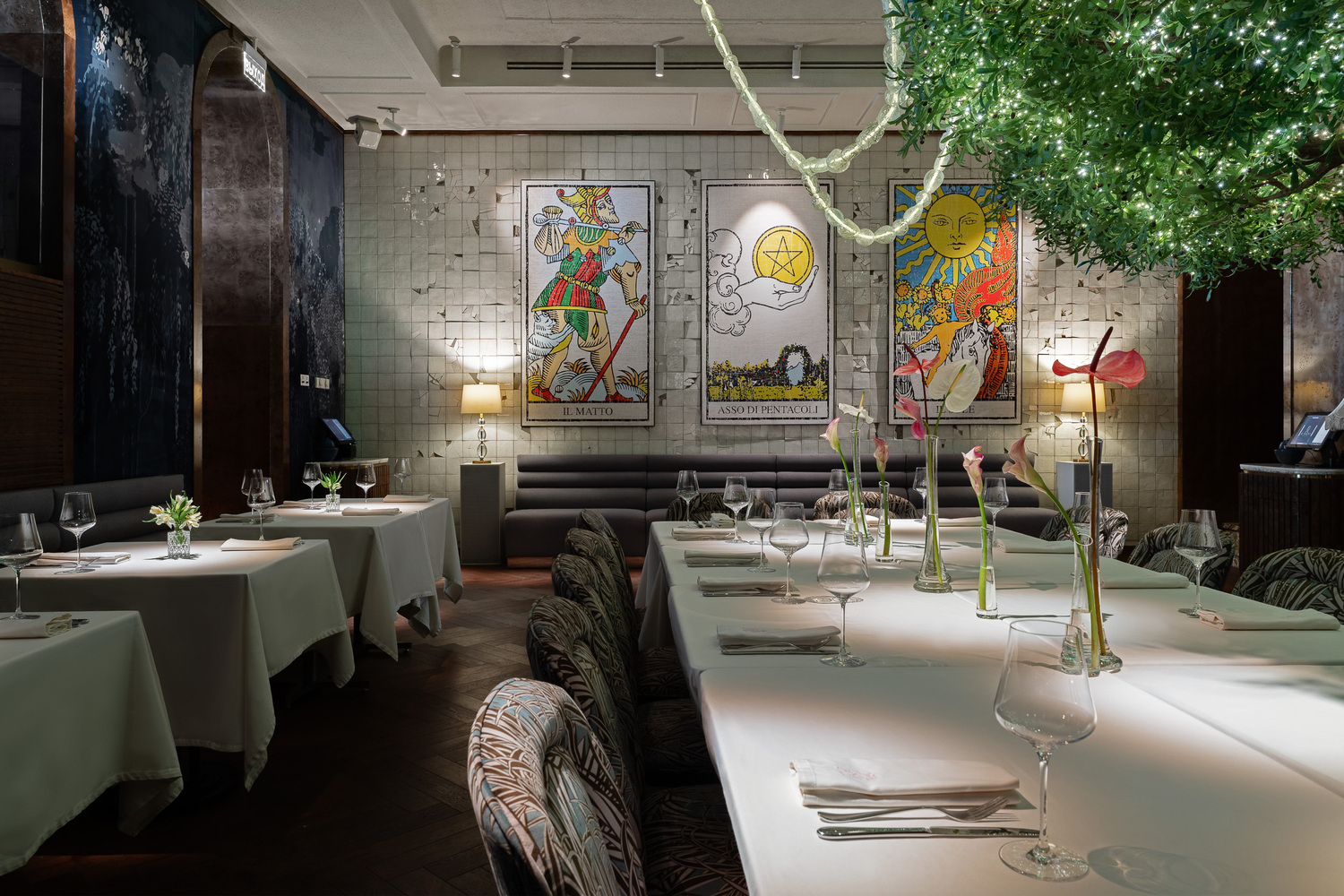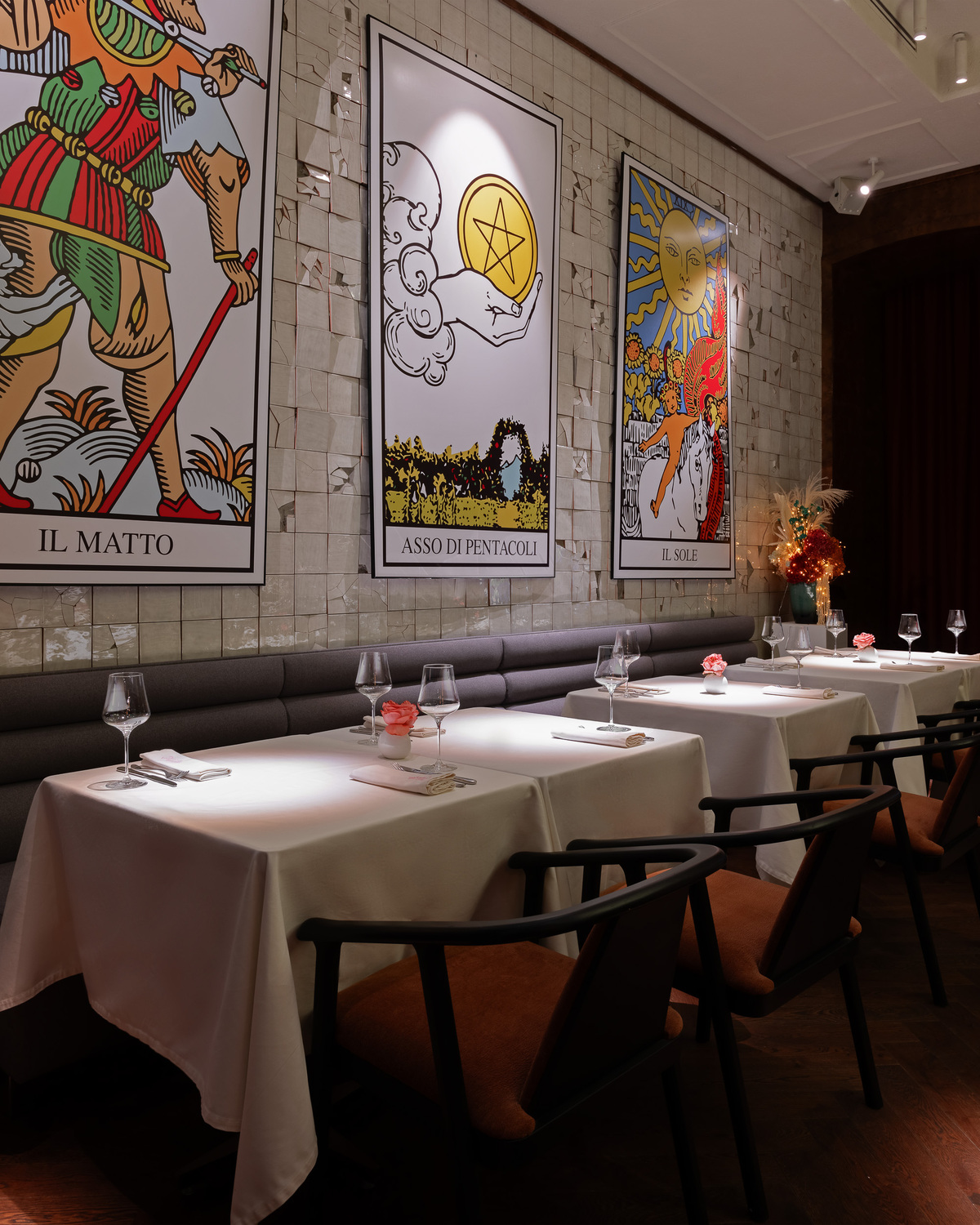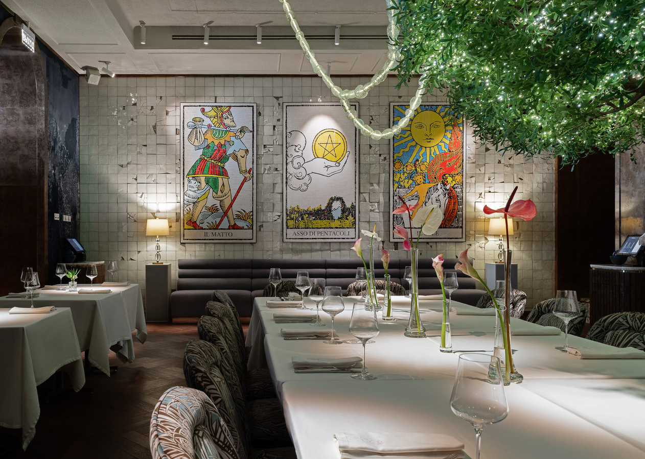 Оформление залов IL MATTO заслуживает отдельной главы в журнале об архитектурных трендах. Команда дизайнеров во главе с Сашей Винер и бюро DBA Group взяла за основу архетипический образ «Il Matto» (Шут) из марсельского Таро — символ свободы, легкости и новых начинаний. Этот смелый концепт превратил ресторан в идеальную декорацию для премиум-мероприятий.