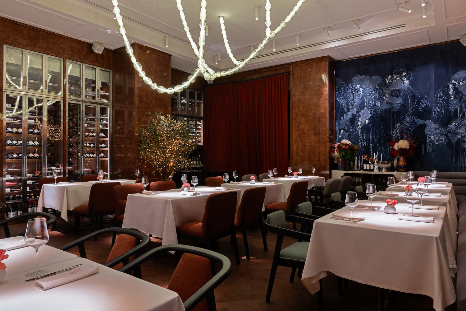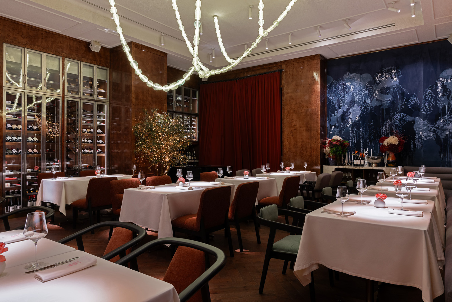 Здесь царит атмосфера наполненности: изобилие мрамора различных оттенков перекликается с бархатными панно, а работы художника TONY в стиле абстрактного экспрессионизма добавляют дерзкий аккорд.